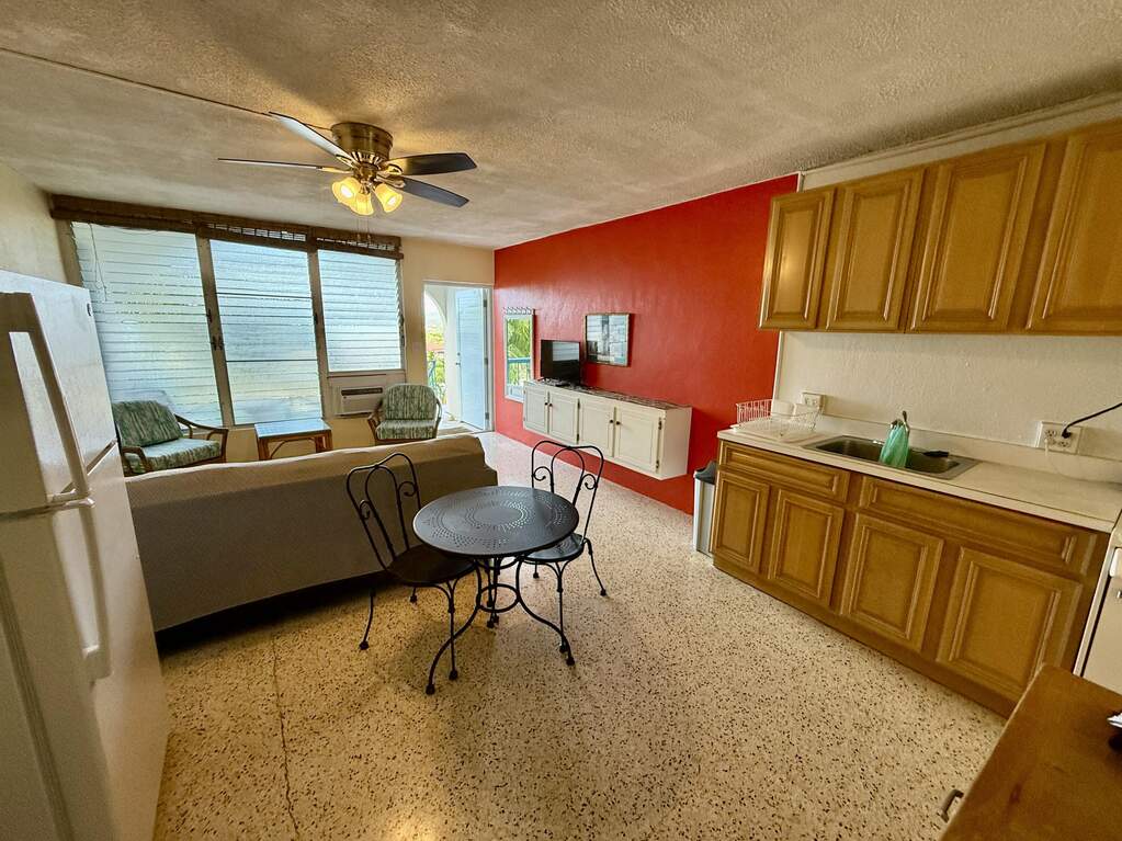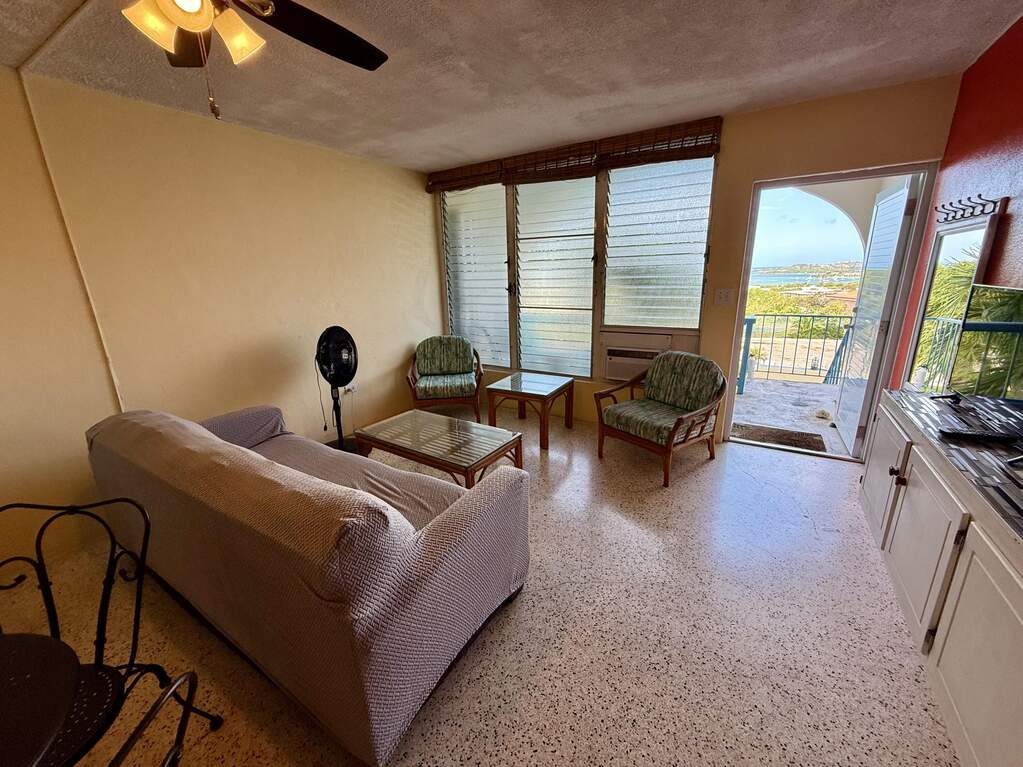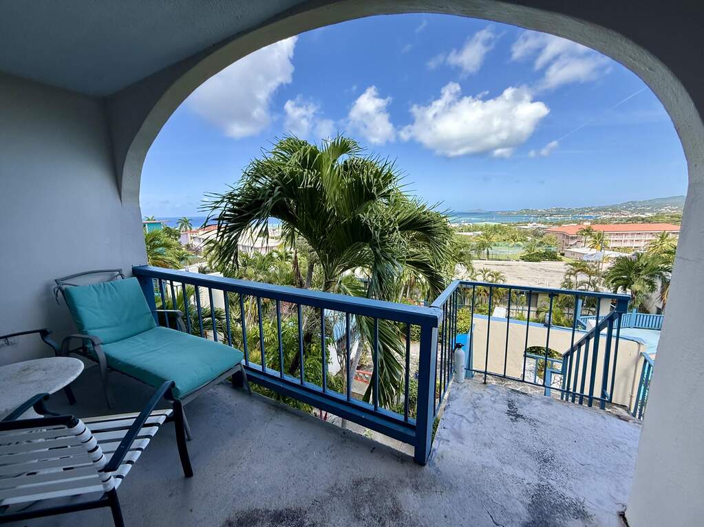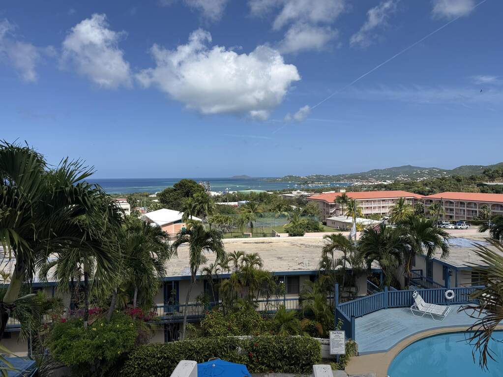 Spectacular view of Christiansted Harbor and the colorful waters of the beautiful Caribbean Sea from this top floor condo at popular gated Long Reef. Originally a studio floor plan, a conversion was made creating a separate bedroom with a mini ''great room'' featuring a full sized fridge (18 cu ft), so you've got plenty of room to stock up at Cost U Less! Perfect location if you don't have a car...you can walk to nearby shopping and public transportation and even beautiful historic downtown Christiansted Towne! Open front and rear windows for a delicious TradeWinds breeze, or flip on the AC to cool off after a long hot day! Wifi and a water cap of $50/m included in rent.