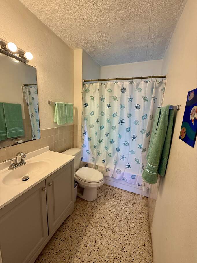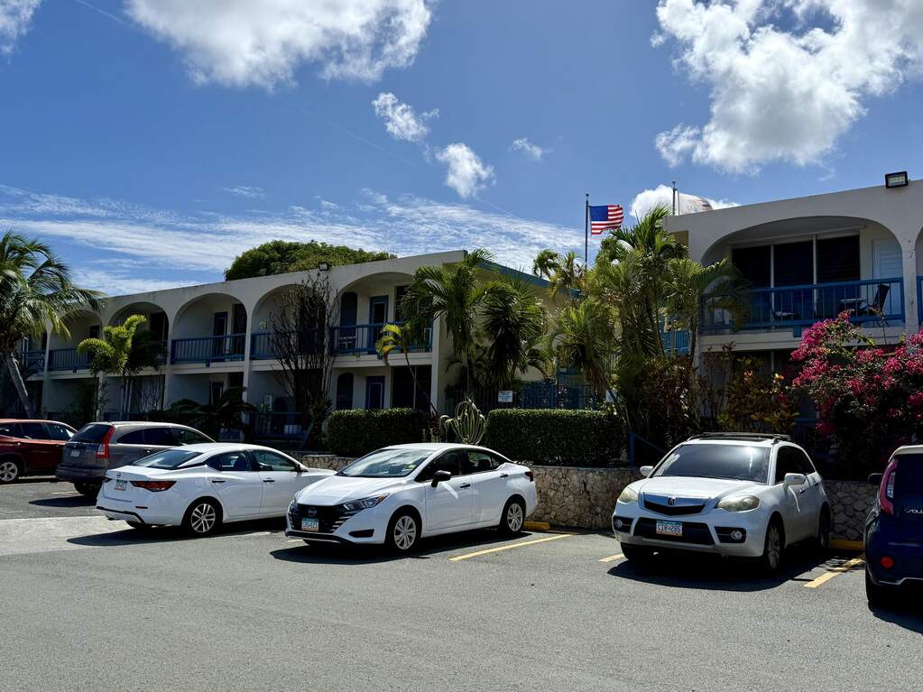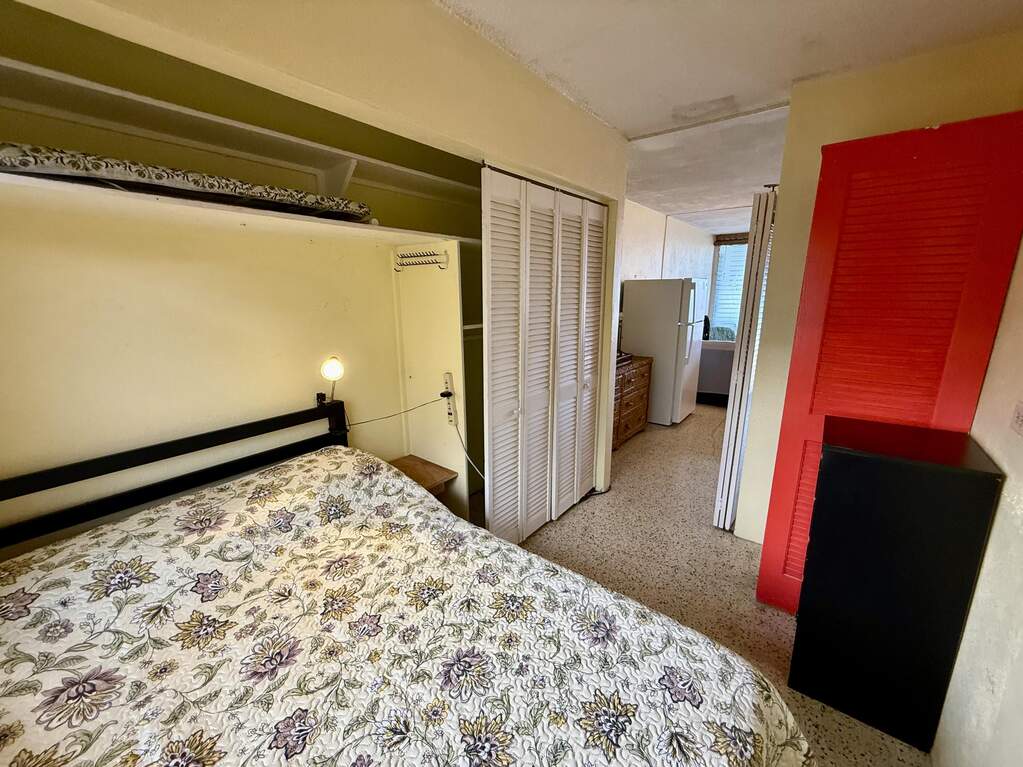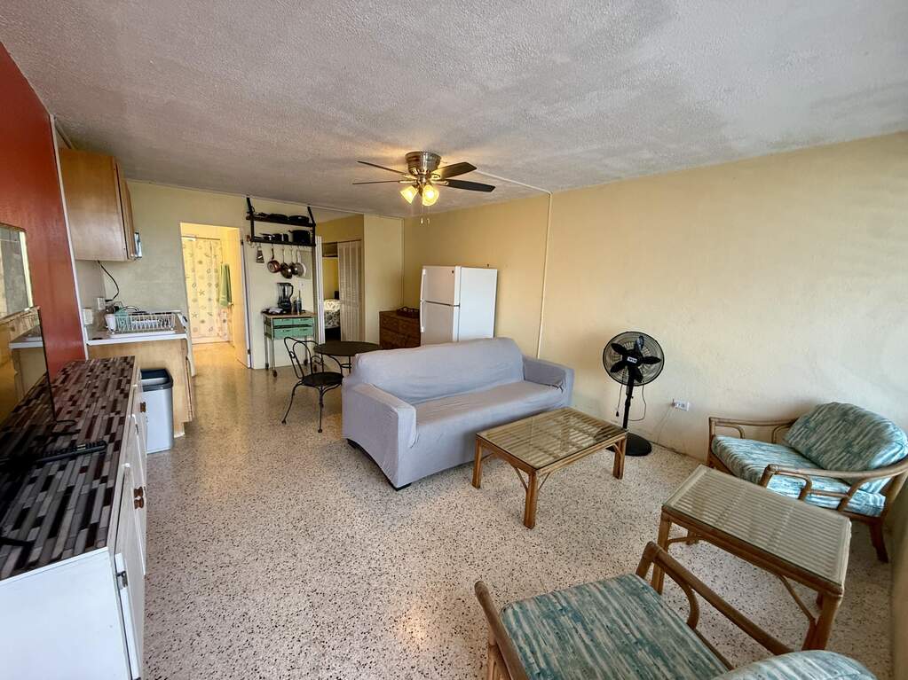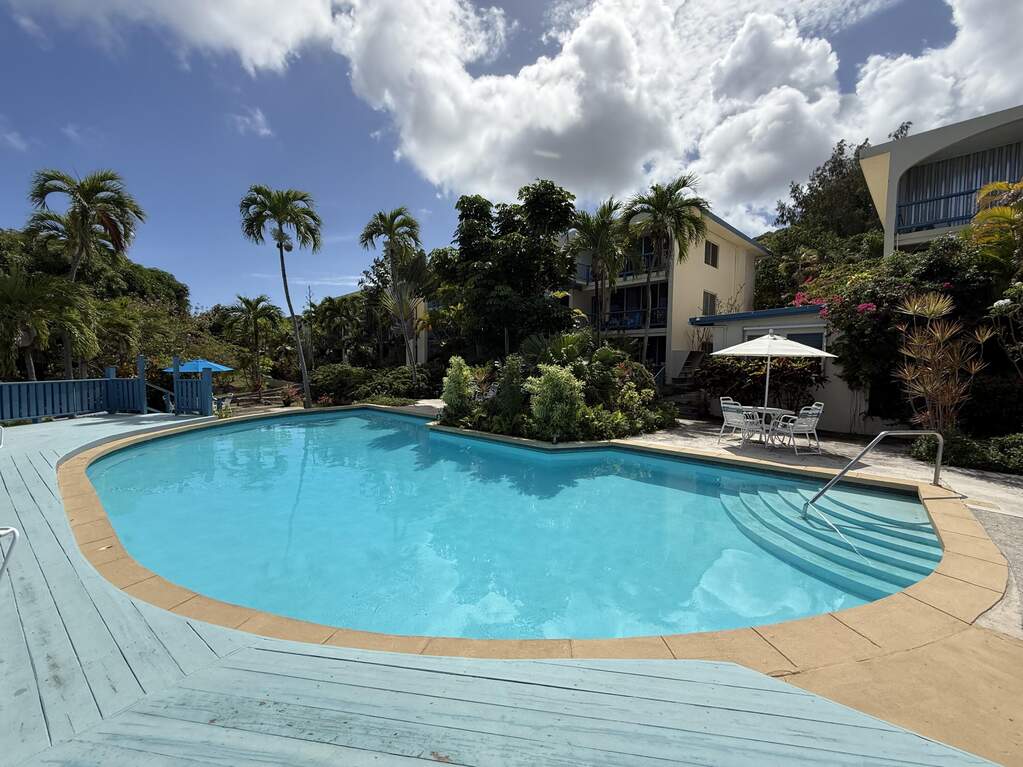 Spectacular view of Christiansted Harbor and the colorful waters of the beautiful Caribbean Sea from this top floor condo at popular gated Long Reef. Originally a studio floor plan, a conversion was made creating a separate bedroom with a mini ''great room'' featuring a full sized fridge (18 cu ft), so you've got plenty of room to stock up at Cost U Less! Perfect location if you don't have a car...you can walk to nearby shopping and public transportation and even beautiful historic downtown Christiansted Towne! Open front and rear windows for a delicious TradeWinds breeze, or flip on the AC to cool off after a long hot day! Wifi and a water cap of $50/m included in rent.