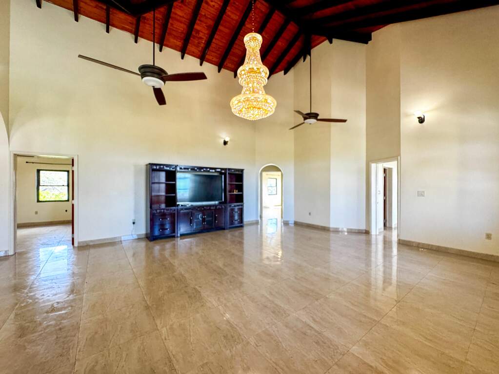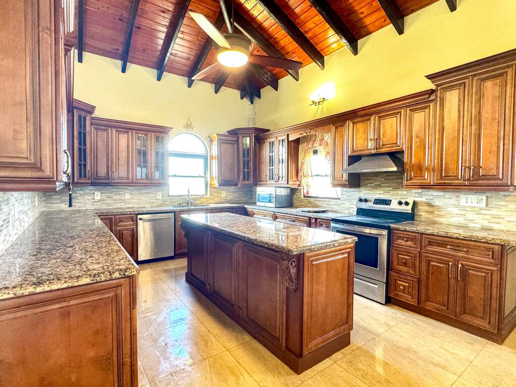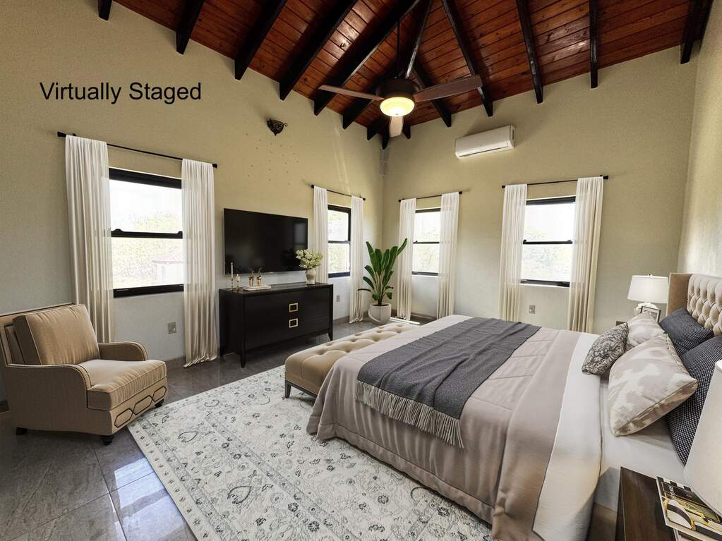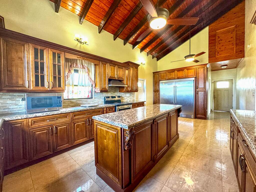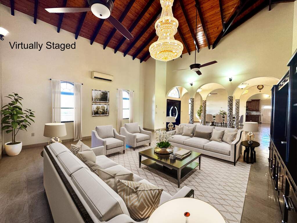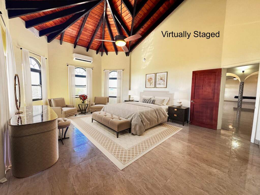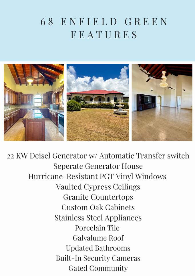 Gorgeous turn key property in the gated community of Enfield Green. Located on St. Croix's south shore, this spacious 4 bedroom, 3 bathroom home sits on 0.67 acres with stunning views of the Caribbean Sea. Built in 2017 the home was designed with both comfort and durability in mind. Adorned with high end finishes, a custom oak wood kitchen with granite countertops, stainless steel appliances, updated bathrooms, porcelain tile throughout, gorgeous high vaulted Cypress wood ceilings, split A/Cs throughout, hurricane-resistant PGT vinyl windows, Galvalume roof, built-in security cameras, and 22 KW diesel generator with automatic transfer switch, this property combines elegant modern living with practical island features. Step inside the elegant entryway to a grand open floor plan with soaring high ceilings, gorgeous high end finishes, and custom chandeliers. A spacious open living and dining room creates a harmonious space for entertaining and relaxation filled with natural light bringing warmth and comfort to the home. The gourmet kitchen is the perfect place for entertaining, featuring stainless steel appliances, custom cabinetry and granite countertops. The home is adorned with two primary suites both with en suite bathrooms and spacious walk-in closets, plus two generously sized guest bedrooms with a shared bathroom for guests. Enjoy beautiful views of the Caribbean sea with cool breezes and warm golden sunsets from the cozy front porch. The spacious back patio is perfect for outdoor dining and relaxation, while the expansive backyard offers room for entertaining, gardening or simply enjoying the peaceful island life. Just minutes away from the airport, beaches, restaurants and historic Frederiksted, this beautiful modern home is the best of island living.