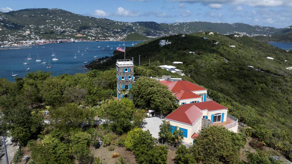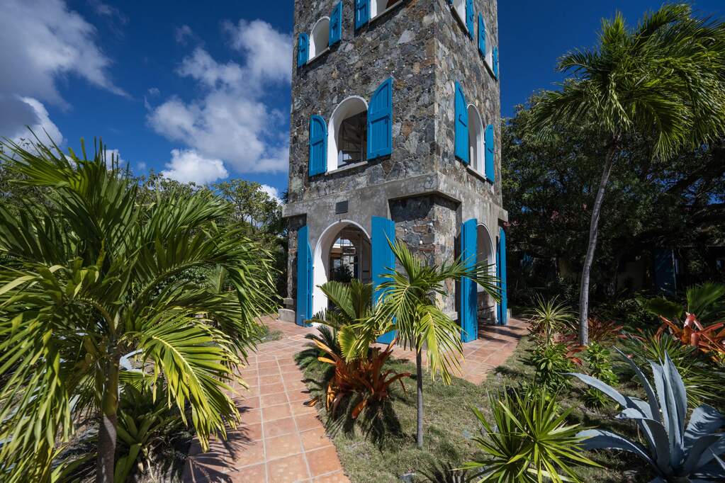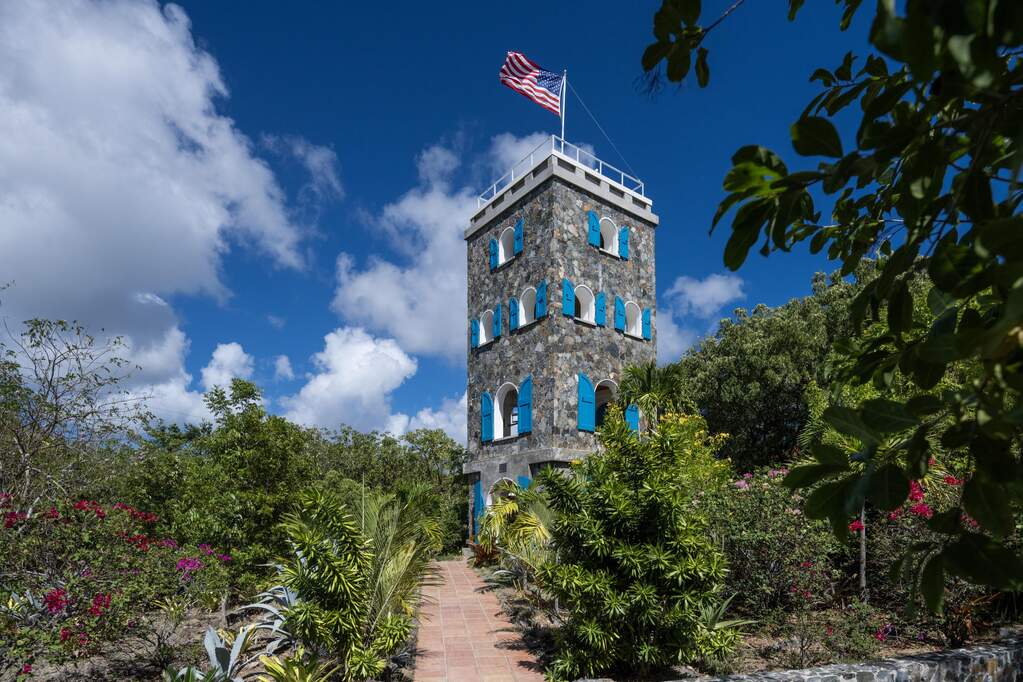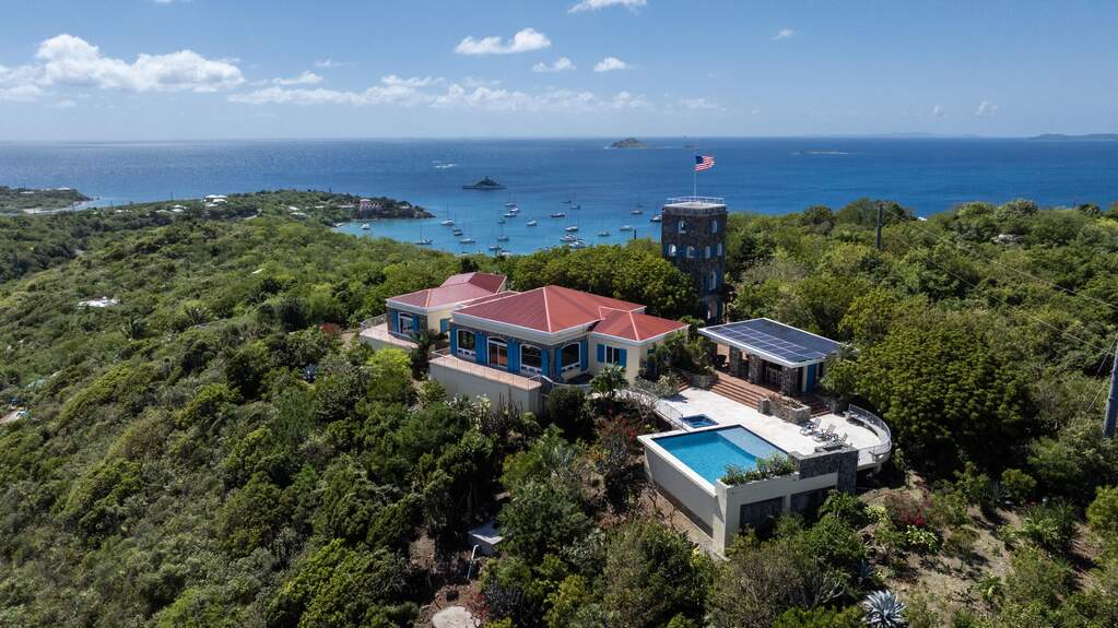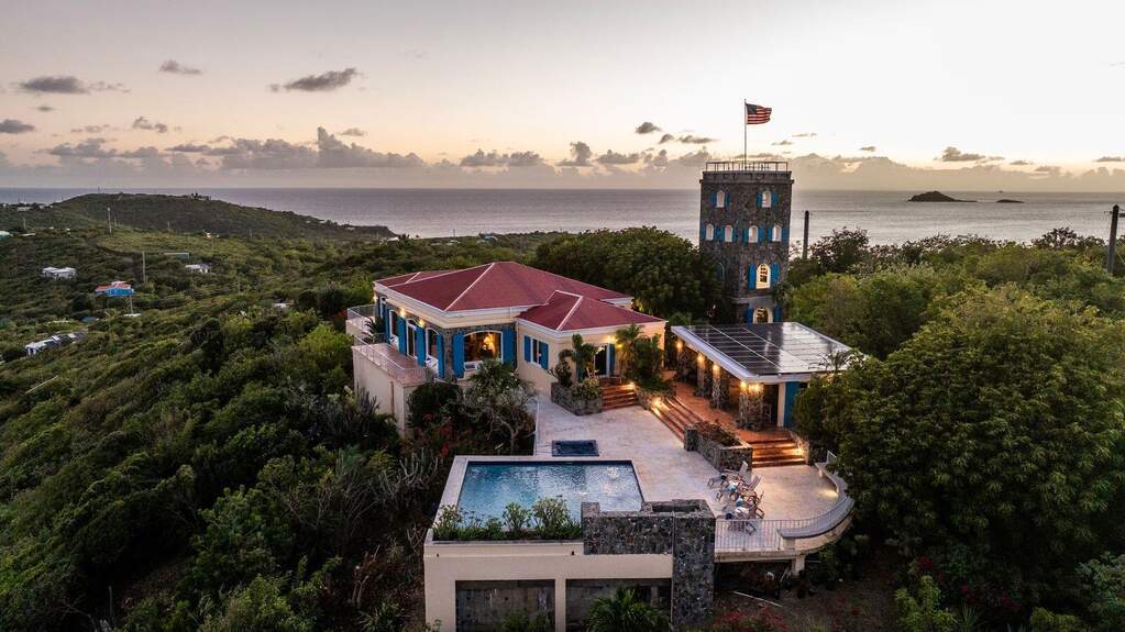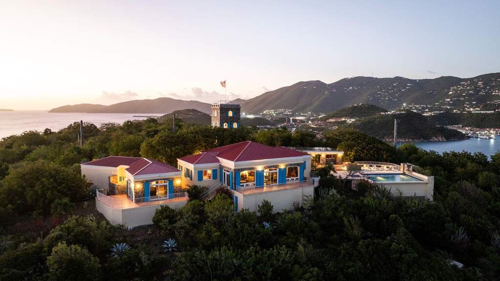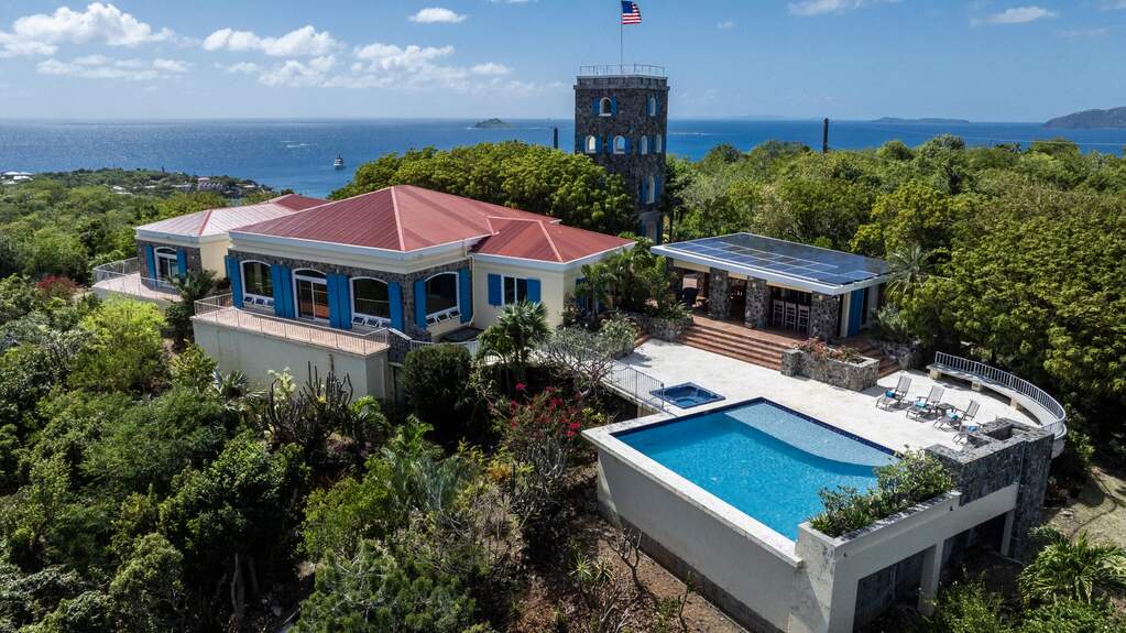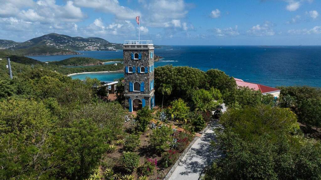 Perched at the highest point of Providence Hill on 3.24 acres, 88 Water Island is widely regarded as one of--if not the--most extraordinary private residences on Water Island. With commanding views to the East, South, and West over the Caribbean Sea, and St. Thomas to the North, this landmark property offers a rare combination of history, privacy, craftsmanship, and panoramic beauty. Originally selected by the U.S. Army Corps of Engineers during World War II as a strategic observation and communications site, the property's iconic three-story steel-reinforced concrete tower remains a defining feature. In the early 2000s, the estate was thoughtfully rebuilt and expanded by renowned Virgin Islands architects John Woods AIA and Jaredian Design Group blending traditional West Indian plantation-style architecture with enduring, hurricane-resilient construction. The result is a residence that feels both timeless and purpose-built for island living. The main residence and separate structures total 5,326 square feet under roof, with thoughtfully designed indoor and outdoor living spaces that flow seamlessly together. Vaulted cypress ceilings soaring up to 20 feet, Saltillo tile floors throughout, and extensive use of custom South American mahogany--doors, windows, cabinetry, trim, and shutters--all contribute to the home's warmth and authenticity. The great house is naturally ventilated by constant trade winds, while the private master suite offers air conditioning, sweeping ocean views, and a stone outdoor shower. Designed for both self-sufficiency and entertaining, the estate features a 28' x 20' swimming pool, spa, expansive tiled terraces, and a beautifully restored pool pavilion with a 12-foot mahogany bar, half bath, and outdoor shower--fully storm-shuttered and easily convertible to an additional guest suite. Infrastructure includes 41,100 gallons of cistern capacity, a 11kW solar grid-tie system, whole-house water filtration with UV purification, a 2026 11kW diesel generator, hurricane-rated shutters, and a NEW Galvalume roof. The historic observation tower--renovated with colonial stonework and modern utilities--offers four finished interior levels and a rooftop observation deck accessed by a rust-free aluminum spiral staircase. From the top, enjoy 360-degree views spanning St. Croix, Vieques, Culebra, Puerto Rico, St. Thomas, and all of Water Island--a vantage point unlike anything else in the U.S. Virgin Islands. Surrounded by mature landscaping, including over 40 of West Indian mahogany trees and one of the largest neem trees on the island, Providence Hill is not just a home--it is a legacy property, built to endure and impossible to replicate.