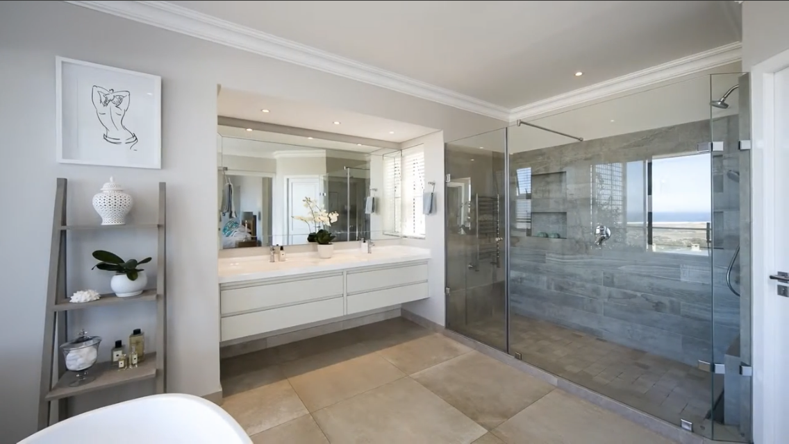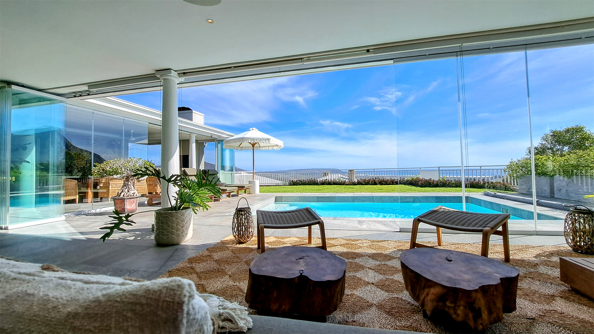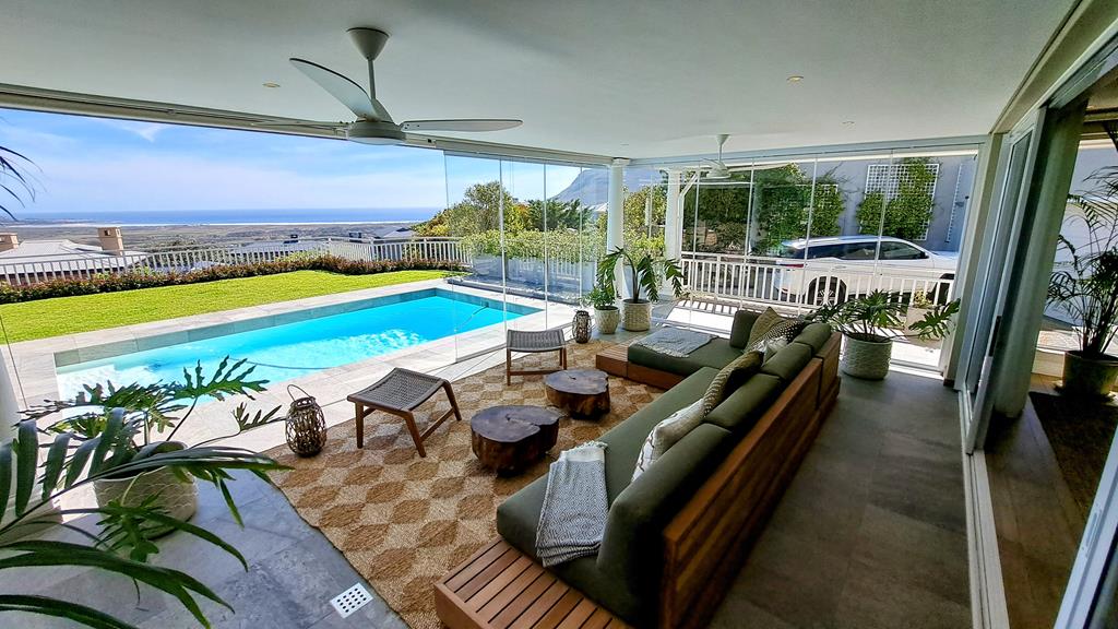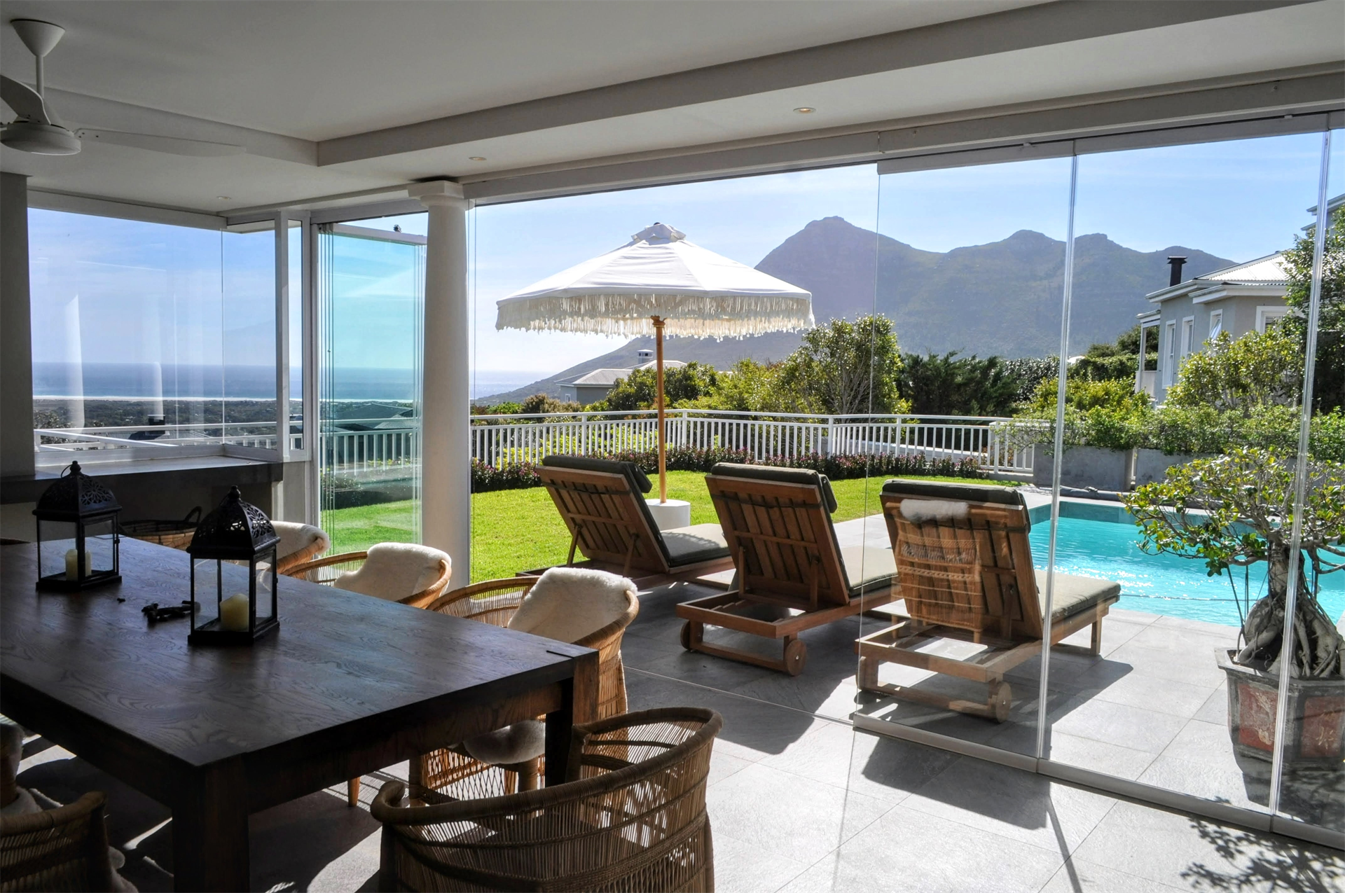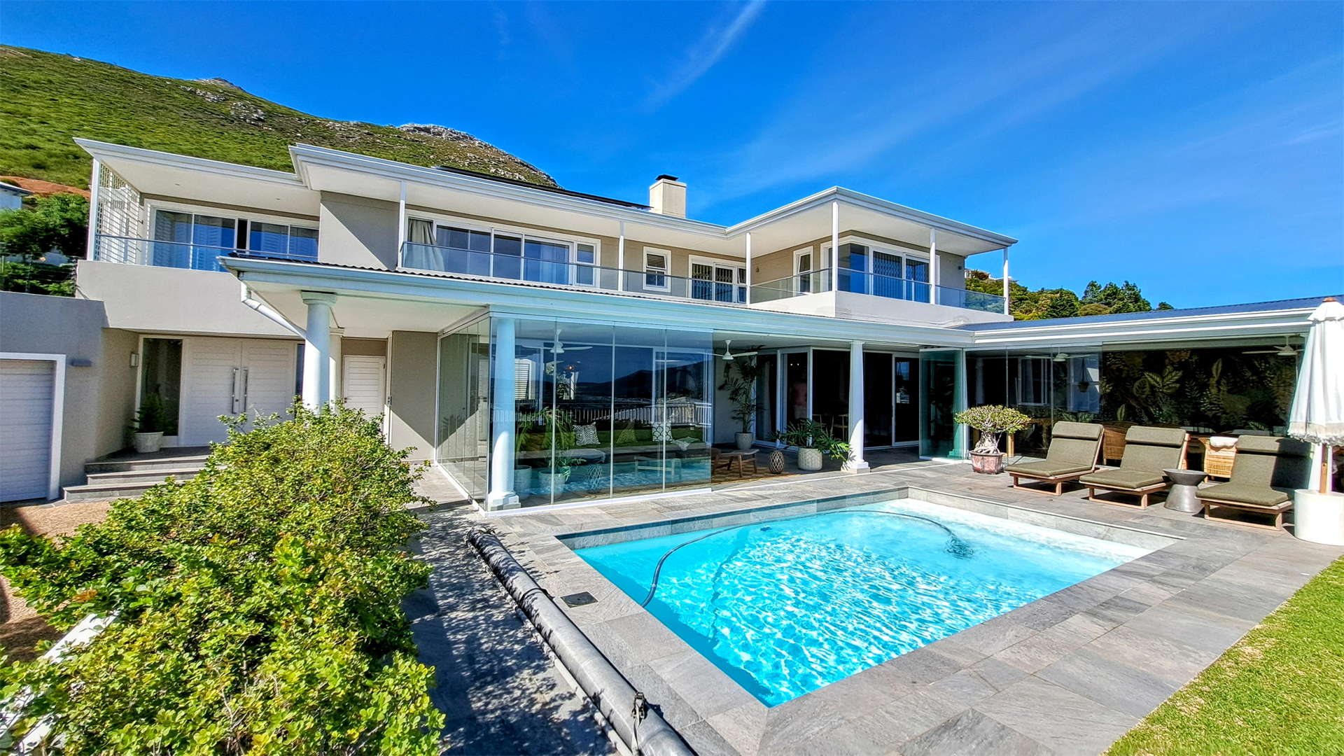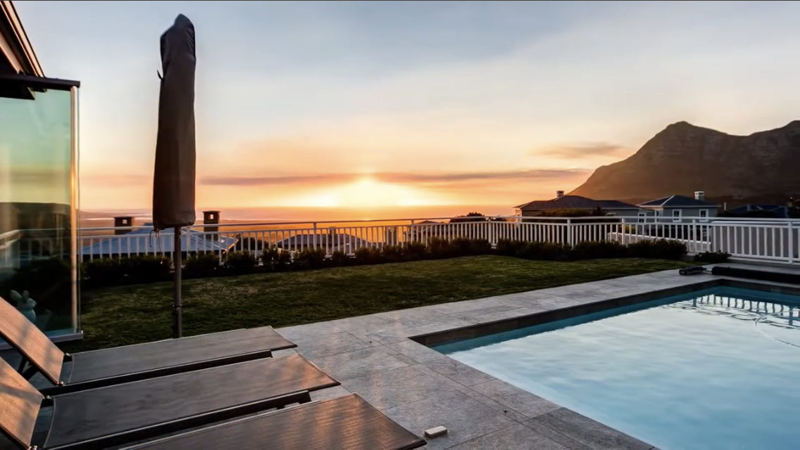 The expansive double lounges and adjacent dining halls flow seamlessly into the pool deck overlooking Noordhoek beachfront. The stone cladded, double sided, wood burning fireplace fills the Home with an inviting ambience.