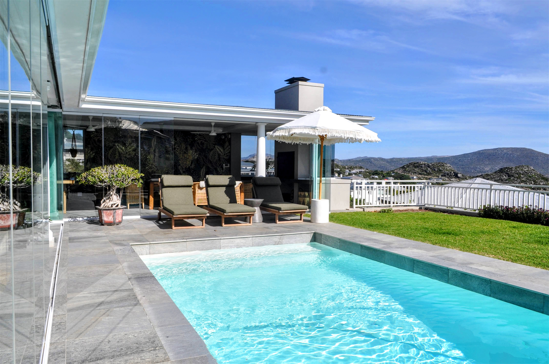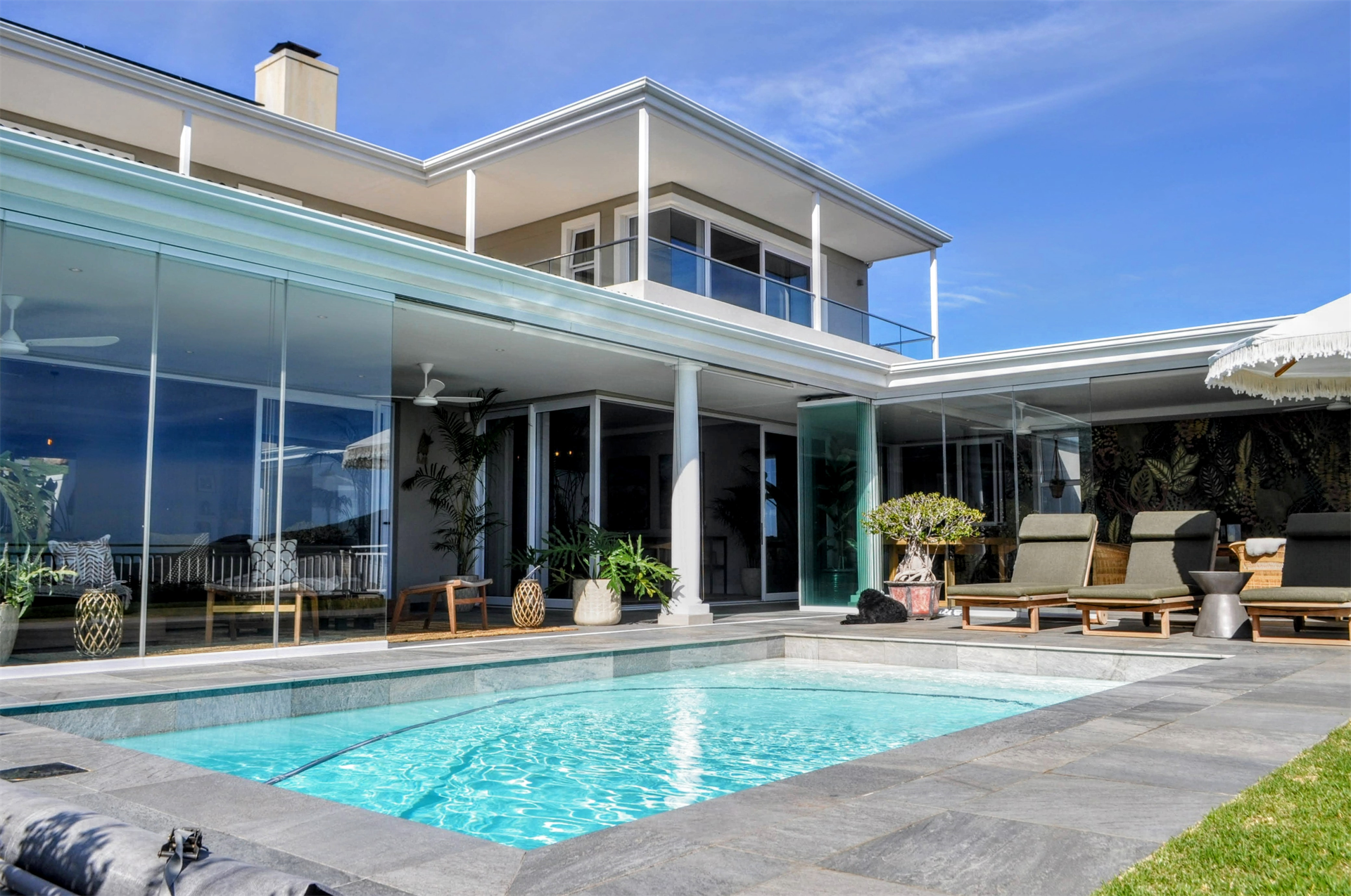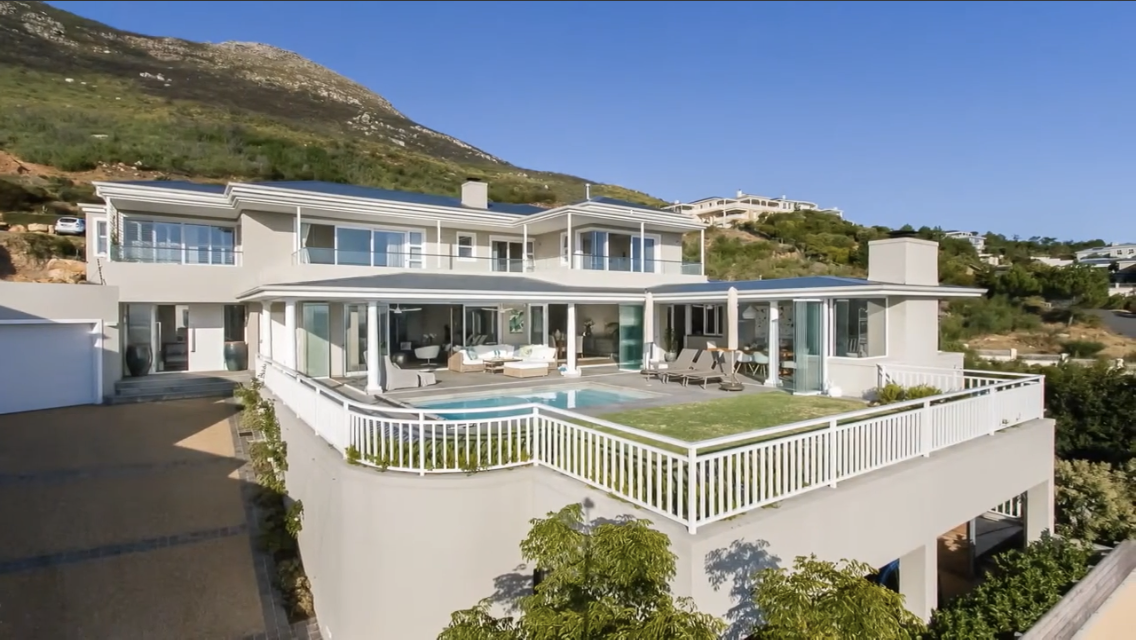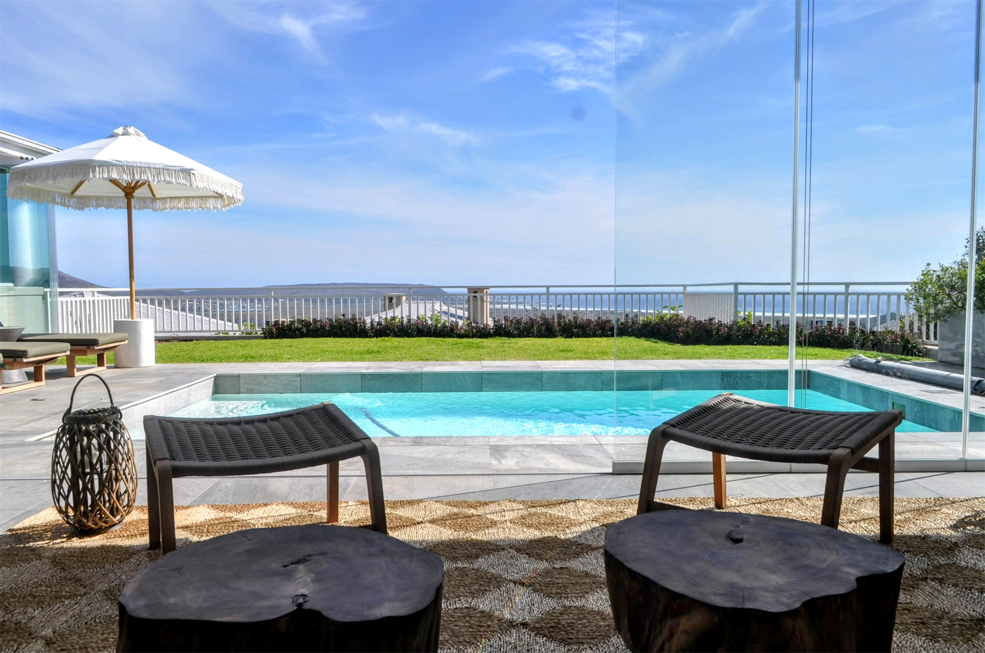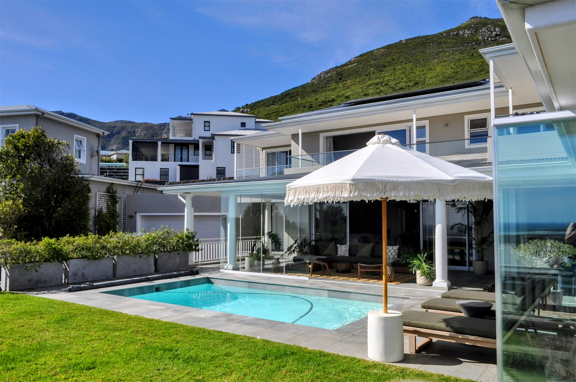 The expansive double lounges and adjacent dining halls flow seamlessly into the pool deck overlooking Noordhoek beachfront. The stone cladded, double sided, wood burning fireplace fills the Home with an inviting ambience.