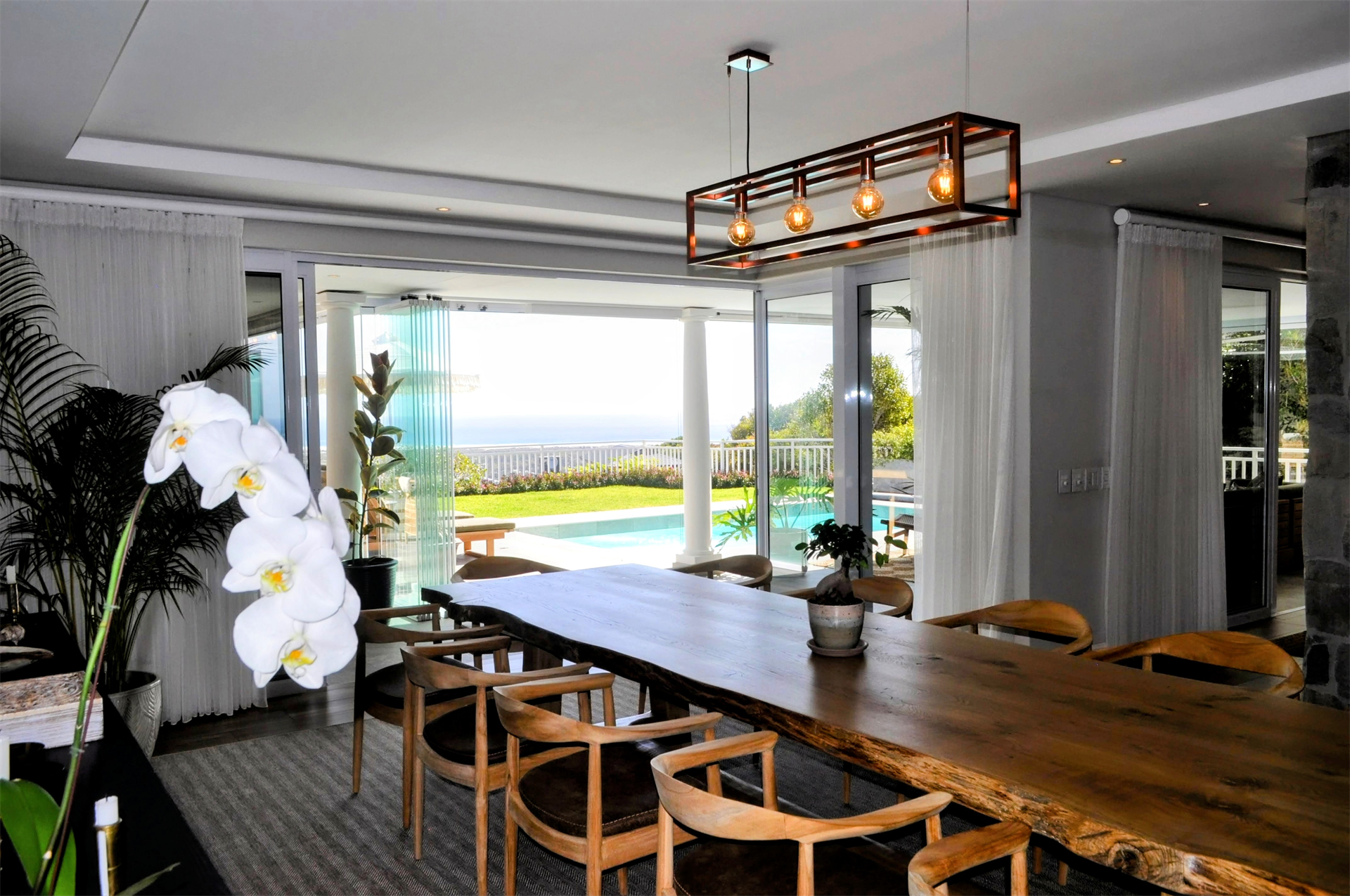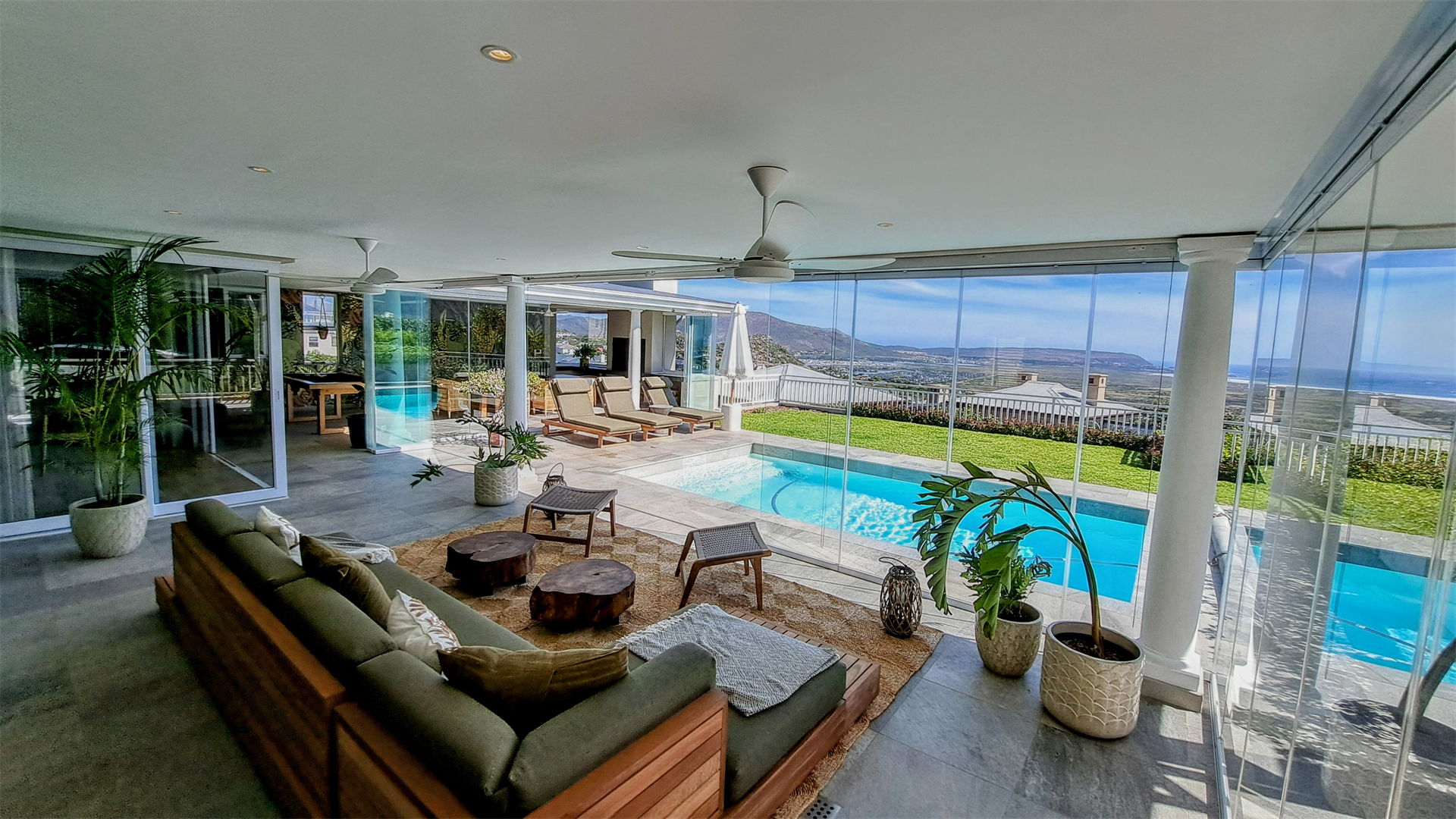 A full bar and custom snooker table adds an element of fun to the informal television lounge, which opens directly onto the enclosed braai room and informal dining room. Seamless, glass, stack-back doors span the breadth of the ground floor living areas - expertly capturing the magnificence of the infinite views stretching to the horizon.