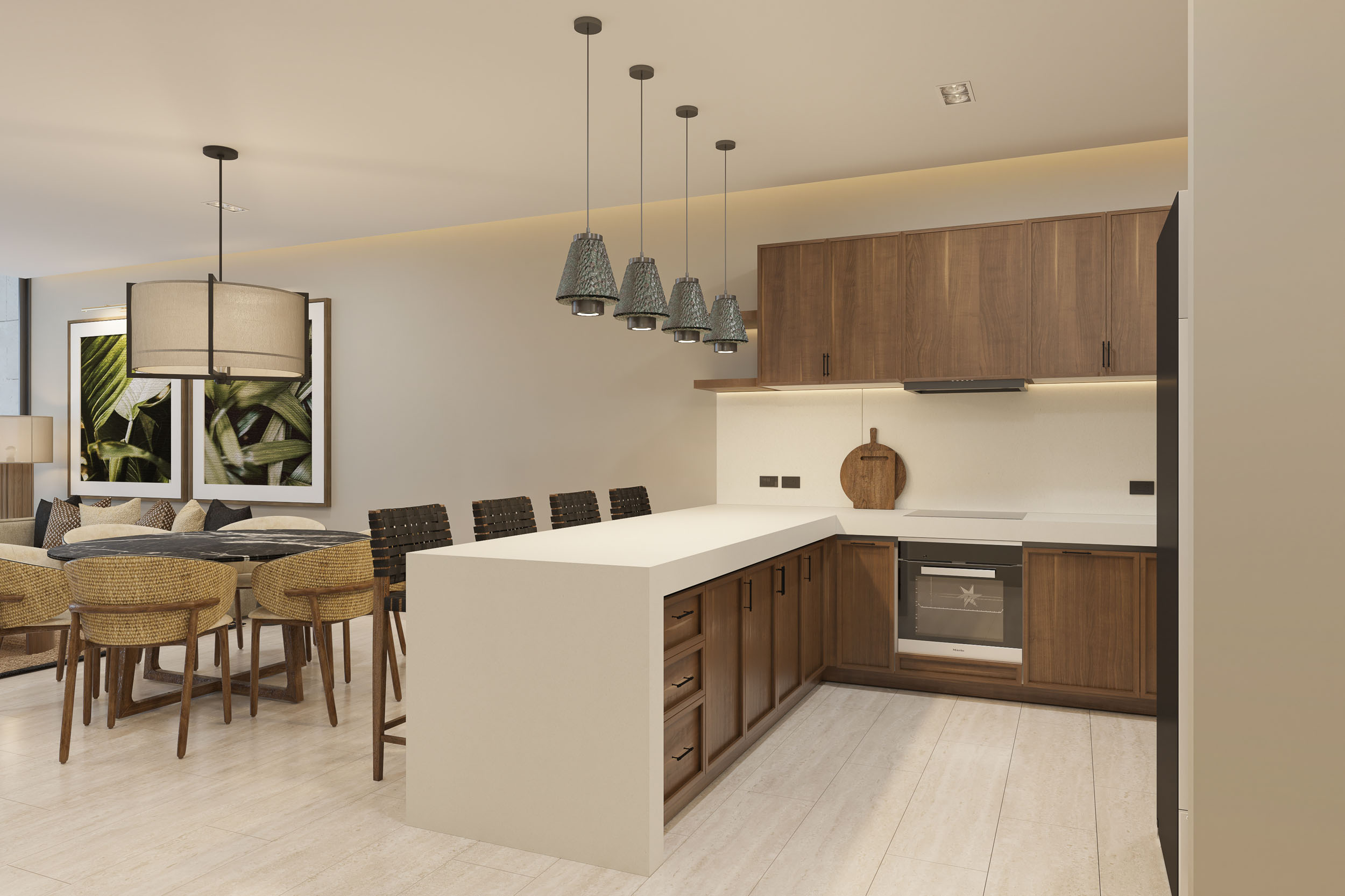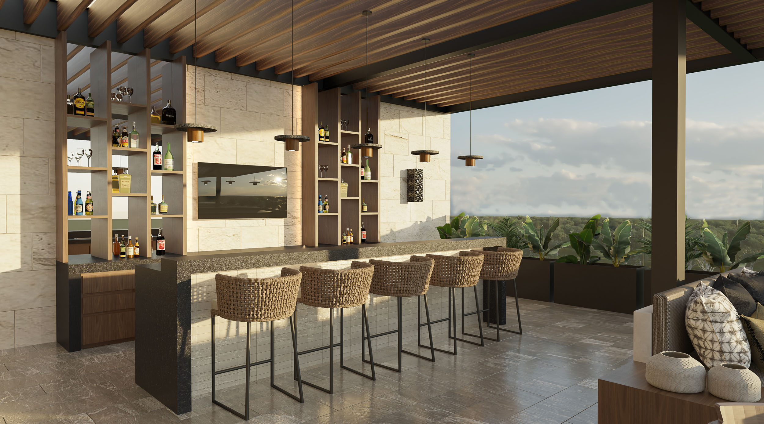Spanning an impressive 3,749 square feet, this penthouse is designed for both comfort and sophistication. The interiors showcase a seamless blend of modern and traditional elements, featuring premium finishes such as stone-clad walls, exquisite woodwork, and natural materials that echo the charm of Yucatán. The master bedroom offers a tranquil retreat with a spacious walk-in closet, a spa-inspired ensuite bathroom, and a luxurious bathtub, while the secondary bedroom also includes an en-suite bath and ample storage. The open-concept living and dining areas are bathed in natural light, creating an inviting atmosphere that flows effortlessly into the state-of-the-art kitchen, complete with sleek granite countertops and high-end appliances.